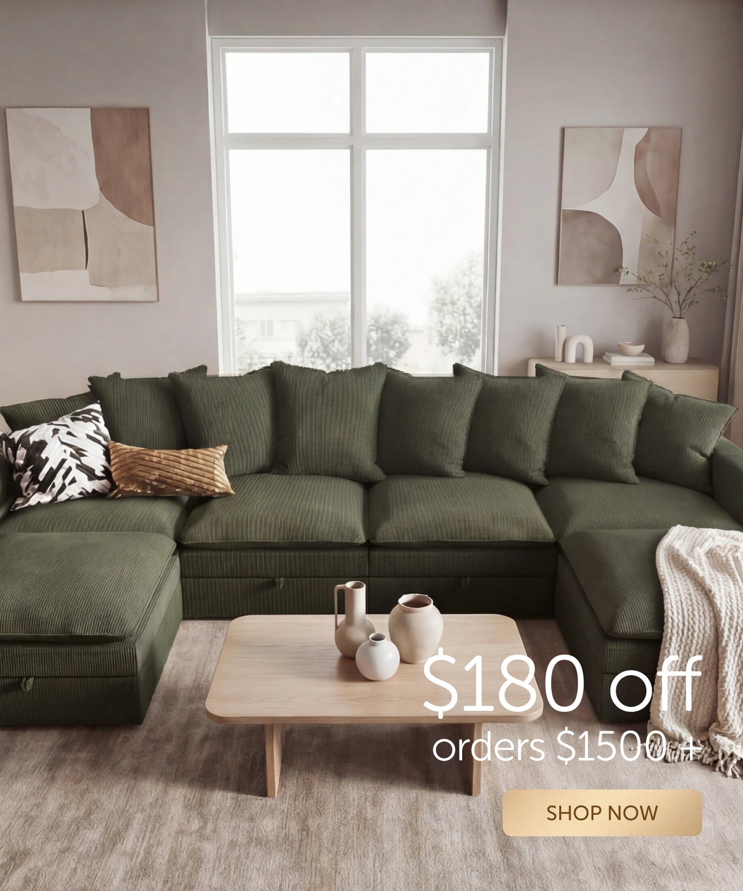 HONBAY 6-Piece Plush double-layer Cushion Corduroy Modular U-Shaped Sectional Cloud Sofa With 2 Storage Ottoman
