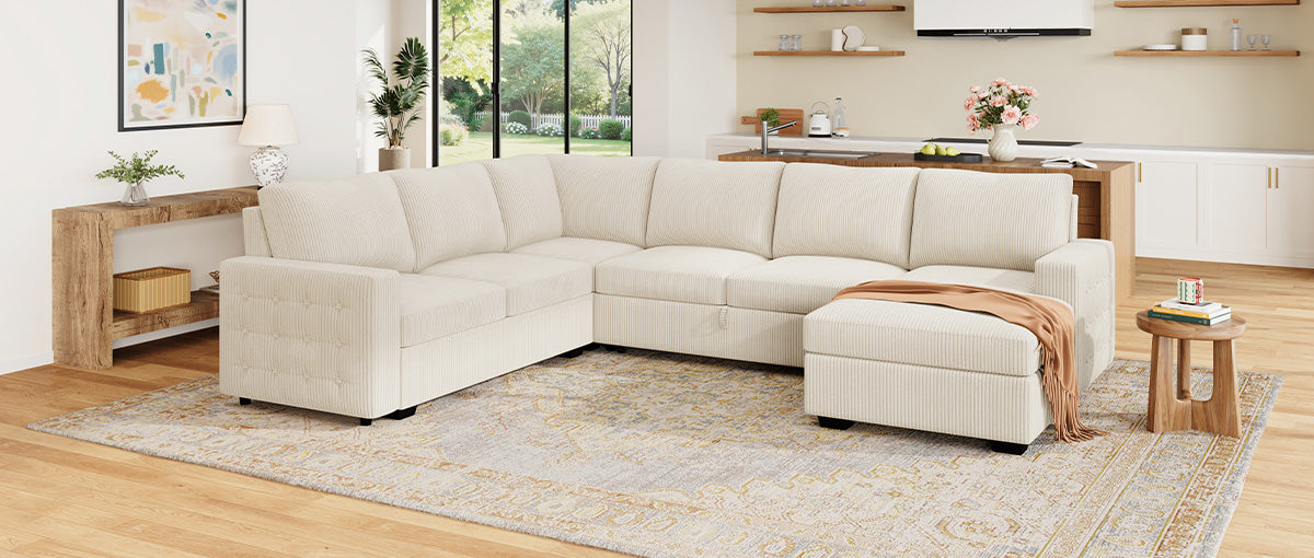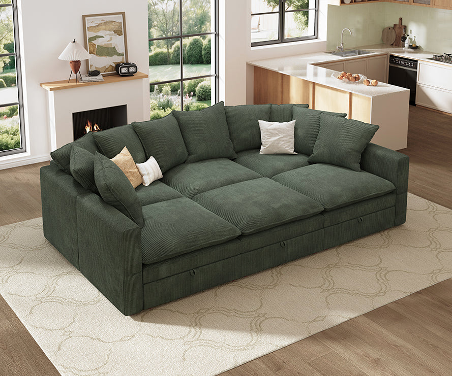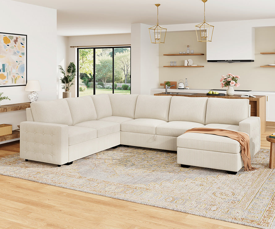 HONBAY 6-Piece Corduroy U-Shaped Pull-Out Sleeper Sectional Sofa with Storage Chaise