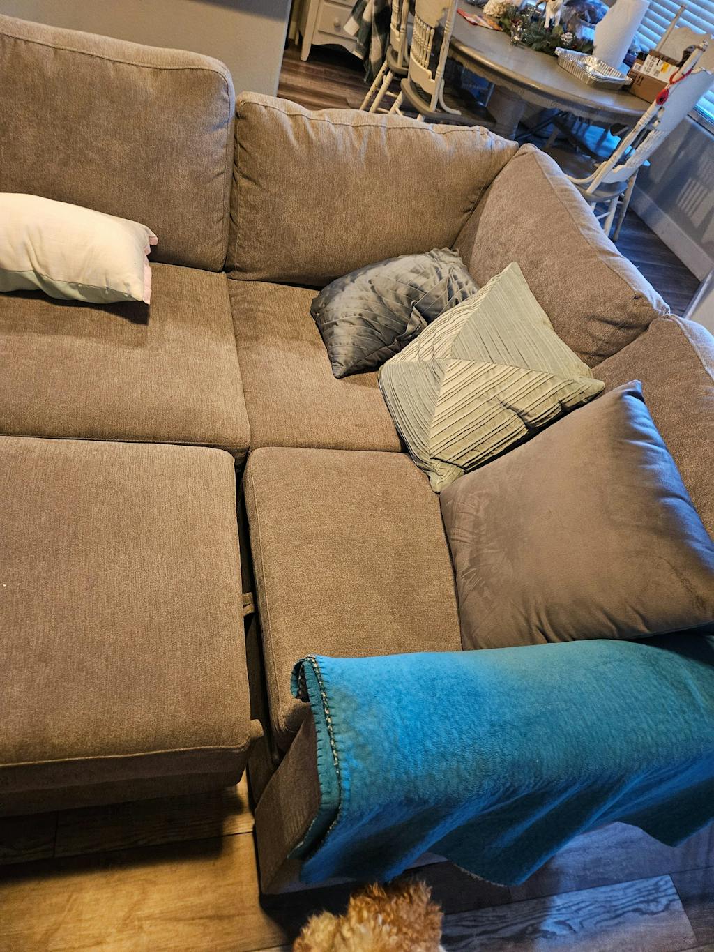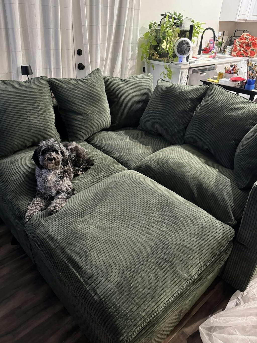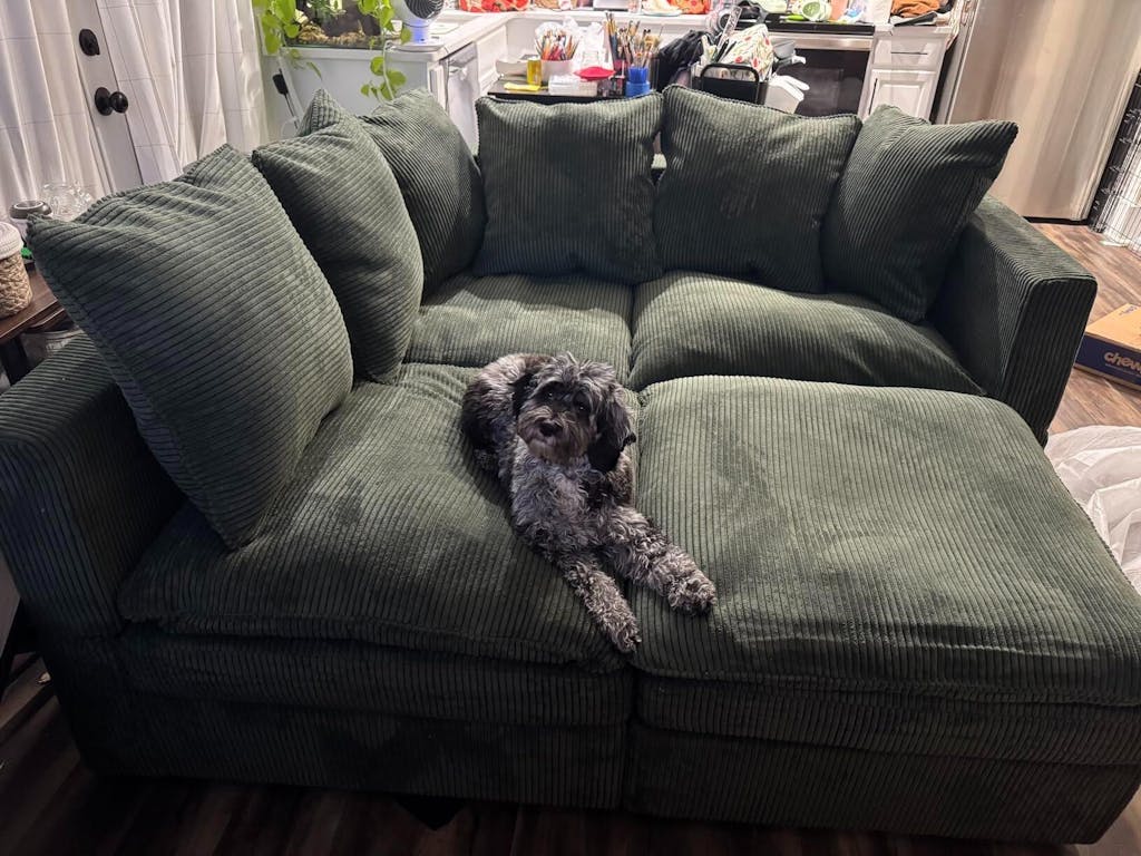 Wow, what a great buy. If you’re on the fence about buying it, I’m here to tell you to just do it. I scoured the interwebs for a modular, green, easy to clean, pet friendly couch for my first home purchase. I was a baller on a budget (damn you, down payment). I decided this couch was the one worth taking a risk on. And boy, I’m glad I did. I’ve had it for about a month now and I just had to come back and left this review. There weren’t many reviews when I clicked the “buy now” button; it seemed like a big risk for a likely impossible-to-return item. That said, the customer service for Honbay was responsive and quick when I had an assembly question. That’s always a good sign. I ordered tbhe modular L shaped design for my tiny living room. I love that I can go to the Honbay website and buy more sections if I ever need to. It came in 7 boxes, and they all arrived within 3 days (what??), at the same time (again, WHAT?!), and in appropriate packaging to keep dry even on a rainy delivery day (impressive). The company texted me directly about 24 hours after purchase with shipping/tracking information for all 7 boxes. A friend and I set it up in under an hour. It was easy to set up and the instructions were simple. It comes with so many pillows! The backs/arm rests are all adjustable to lean back… I love this feature but don’t use it often. I have not found any other modular couch (let alone at this price point) that offers that. The cushions fluff up well after opening. The packaging smell goes away in under a day. My only con is that the back rest height is lower than my last sectional, but with the pillows I do not notice it at all. Someone taller might, but my 6’2 father loved it as well. The couch is comfortable and I LOVE IT. My large dog, Arlo, now prefers to sleep on this couch instead of with me 🙄, so apparently he also gives 5 stars. That said, it is easy to clean and maintain, even with a big, hairy, somewhat drooly dog on it daily. A wet washcloth wipes up any little messes, and pet hair vacuums up easily. I have machine washed and dried at least one of the pillow covers on normal cycles and it worked beautifully. The fabric is soft and durable. Lastly, my small house has virtually no storage, so I LOVE that each modular section has added storage. It actually is more functional than I could have ever hoped for. I am so happy with my purchase! I would not sleep on the option to buy this couch if it’s available - people are bound to catch on. Thank you Honbay!
