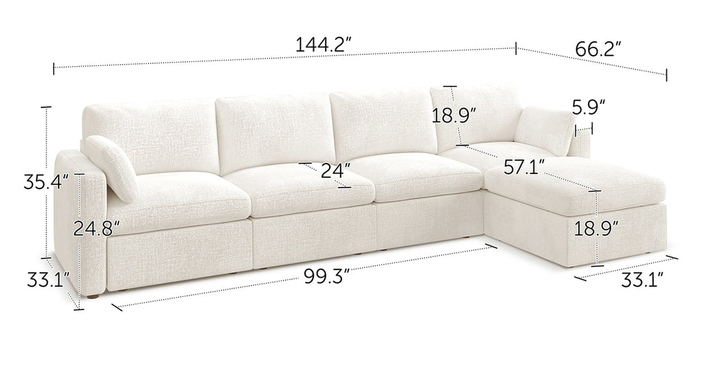 Expertly crafted from high-quality materials, this 4-Piece Cloud modular sofa offers a plush and durable seating option for a luxurious and comfortable experience. Its versatile design allows for various sitting, lying, and relaxing positions, ensuring ultimate comfort. The sofa also includes a large storage compartment, providing convenient organization for your living space.