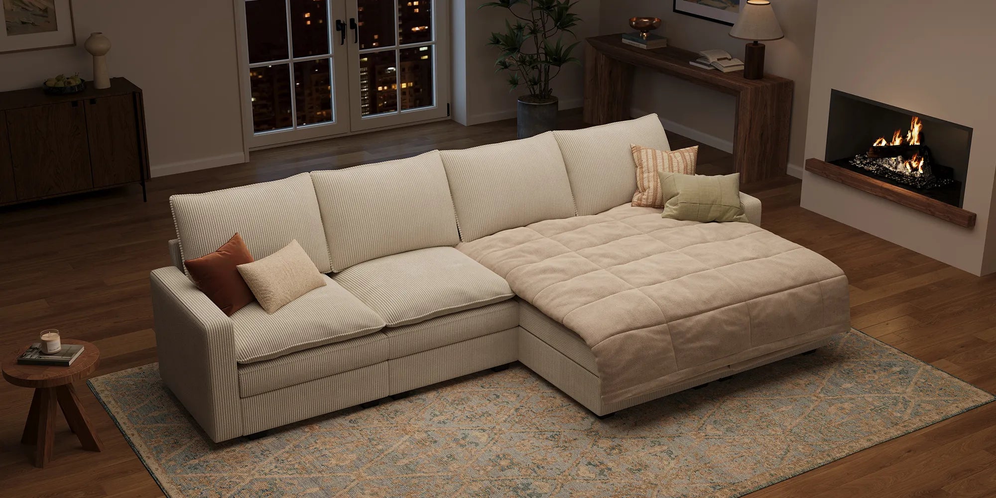 A movable, modular design that transitions effortlessly from daytime living to nighttime relaxation.