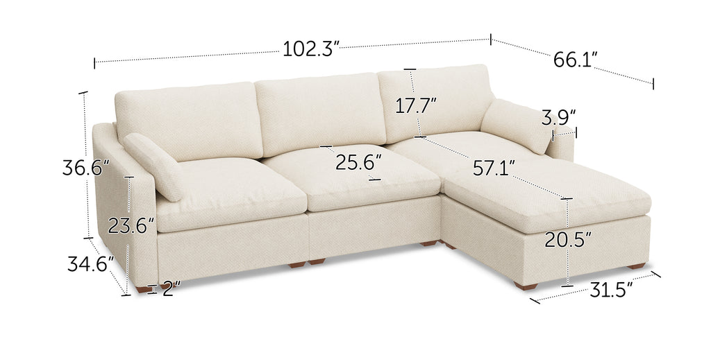 Indulge in cloud-like comfort with our premium down-filled sofa, expertly engineered for modern living. Sink into generously padded cushions wrapping every seat, backrest, and armrest in our signature blend of plush cotton and premium down filling. Upholstered in sumptuous snowflake chenille fabric, available in beige or deep gray. Built on a solid wood and engineered composite board framework, this sofa not only provides exceptional stability but also showcases a modern, minimalist aesthetic with its unique thin armrest design and walnut-colored legs.Our detachable and washable seat, back, and armrest bags ensure that your sofa stays looking fresh and clean, allowing you to enjoy your space without the hassle of complex upkeep. Designed for your convenience, this KD (knock-down) modular sofa allows for simple assembly that any adult can manage independently, making it easy to rearrange or move as needed—perfect for any home setup!