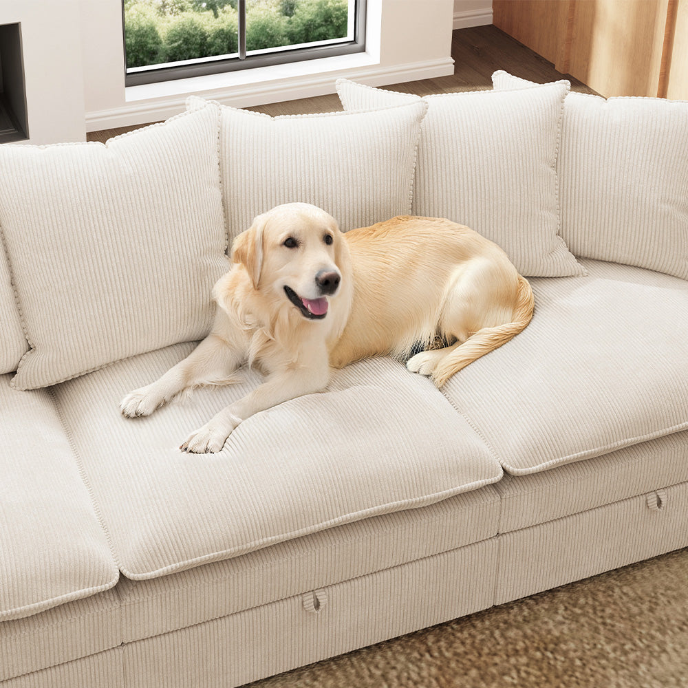 This is literally everything I wanted in a couch! The green corduroy fabric is absolutely gorgeous and super soft. The storage under all the pieces is really convenient. I wasn't sure if I'd like the reclining back/arm rests but it has been a game changer while watching tv and is so much more comfortable! I love that if I were to move somewhere bigger, I could add additional pieces since they're modular. I also love that all of the cushions and pillows have removable covers. It really feels like a big bed the way I have it set up. I'm really hoping it holds up well, but I'm super happy with it as of right now!