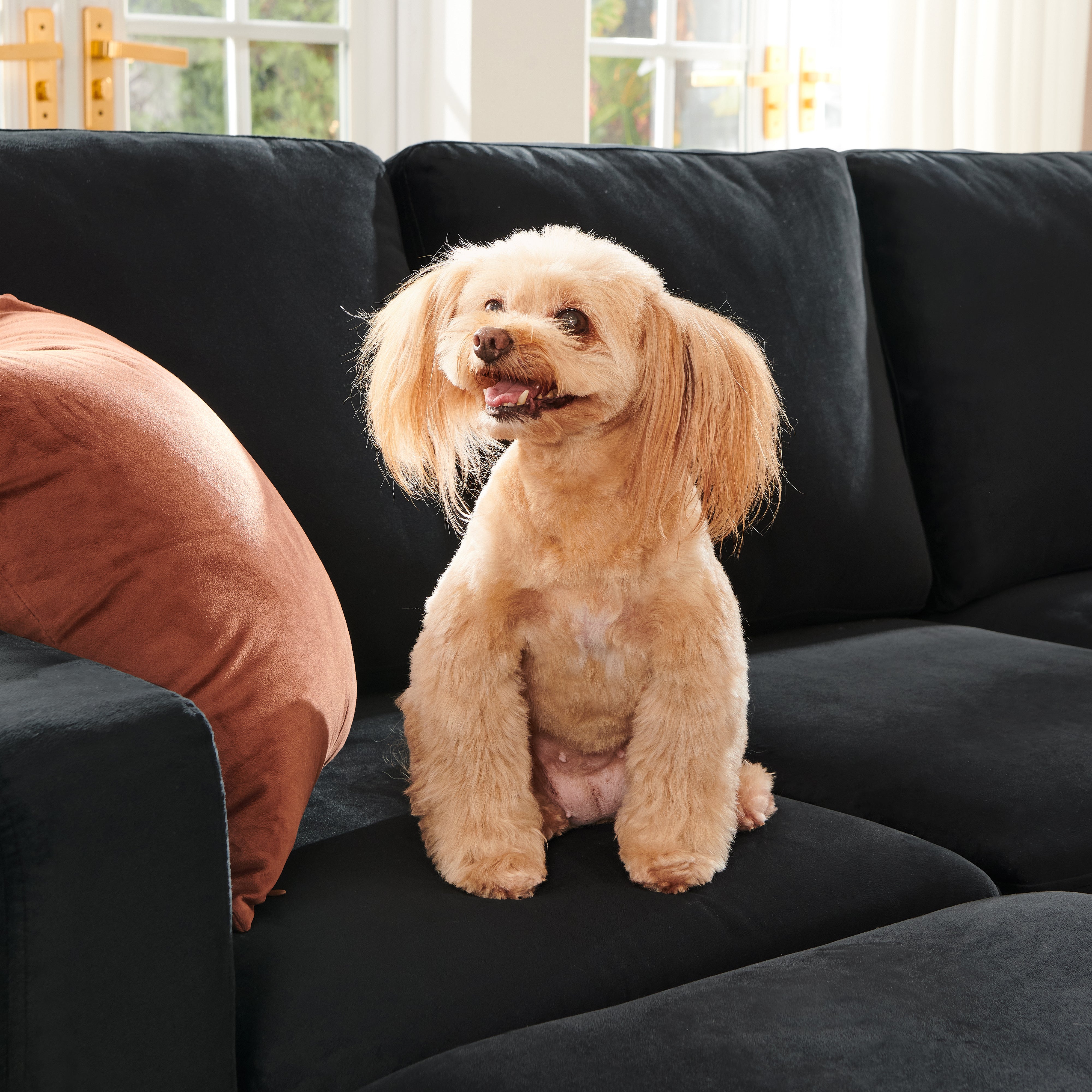 Genuinely love the couch! I even bought an extra seat and use it as a foot rest. It’s good quality and super comfortable! I like the color a lot. It’s a lovely velvet black and just goes so well with my home. I will say it was slightly smaller than I would’ve thought but honestly I think it actually worked out best because I think it fits the space better than I was expecting so a super plus! Wasn’t missing any parts and really easy to put together! Very simple ! Highly recommend! I also got it on sale and it was worth every dollar spent!