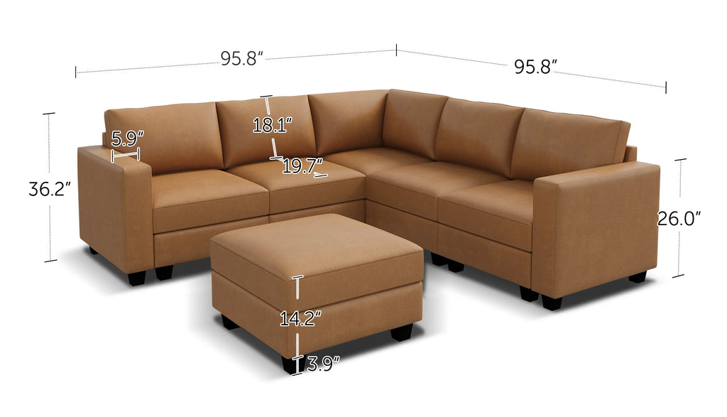 HONBAY 6-Piece Cognac Vegan Leather Modular L-Shaped Sectional Sofa with Hidden Storage Ottomans