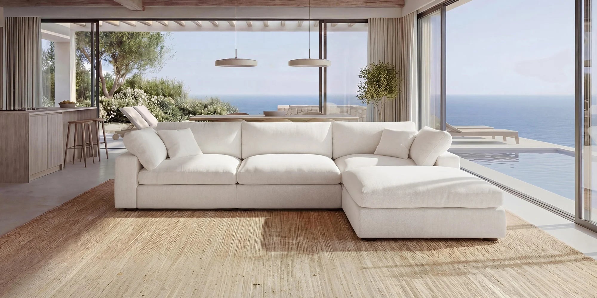 Spacious modules adapt effortlessly to your space. Each seat measures 35.5″ W × 29.5″ D with a 650–700 lb weight capacity. The included 42.5″ × 35.4″ ottoman adds extra lounging and versatility.