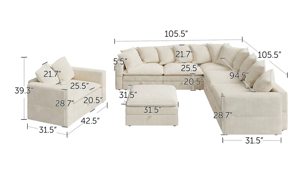 HONBAY 7-Piece Modular Cloud Sectional Sofa Set In Plush Corduroy With Storage Ottoman