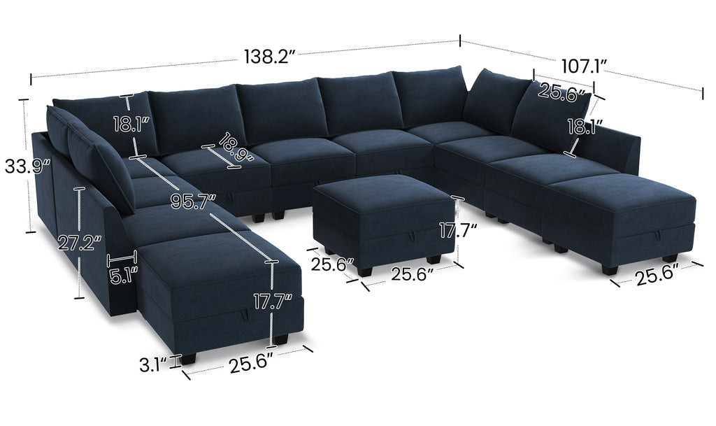 HONBAY 12-Piece Velvet Modular Sleeper Sectional Sofa With Storage Seat